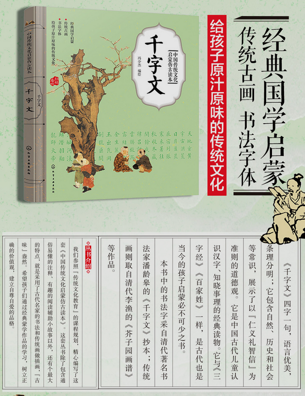 这是一套专为学龄前儿童和低年级的小学生打造的中国古典文学绘本,共17本套书精选经典的情节,采取连环画的形式重新演绎,以期通过这种图文呼应的阅读方式减轻孩子的阅读压力,帮助孩子们更直观地理解原著。《千字文绘本》本书依据千字文的主题内容,分为四个章节:天地万物篇、为人处世篇、建功立业篇和居家生活篇。