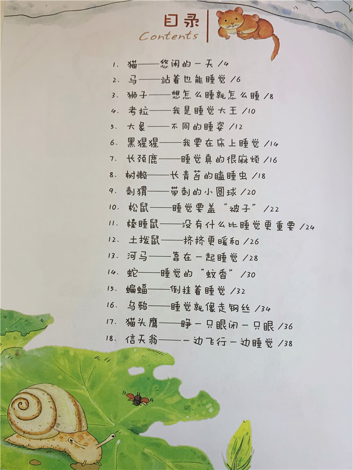 到了晚上,小朋友会上床睡觉,一直睡到第二天早上。那动物们会睡觉吗?它们是不是和人类一样躺着睡觉呢?马喜欢站着睡觉,树懒倒吊在树上睡觉,蛇把身体盘成一团睡觉,蝙蝠倒挂着睡觉……还有些动物是出名的睡觉大王。考拉每天能睡20个小时;榛睡鼠就算被人抓在手心,还能呼呼大睡;信天翁一边飞行一边睡觉……嘘,别吵,我们悄悄地去看一看动物们是怎样睡觉的。