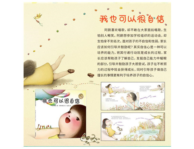本套图书为韩国引进儿童心里成长励志图书,共6册,读者对象为3-7岁儿童。孩子的成长路上难免会跌跌撞撞,3-7岁是儿童心里成长和性格塑造的关键时期,帮助孩子拥有一颗坚强的心灵和良好适应能力,是父母送给孩子最好的礼物。本套图书中的故事温情生动而充满童趣,故事的小主人公像我们现实生活中的孩子一样不完美,他们面临着成长过程中的种种困扰:害羞、不自信、急脾气、胆怯、爱哭……,但最终他们都从自己内心找到了问题的答案。《我也可以很自信》:可爱的小姑娘阿里非常害羞而且不自信,在学校里从来不敢当众讲话,担心同学们会嘲笑她。阿里很想在学校组织的才艺表演上为大家演唱一首歌曲,她该怎样克服自己的害羞和不自信呢?让我们翻开故事需找阿里建立自信的秘密吧。