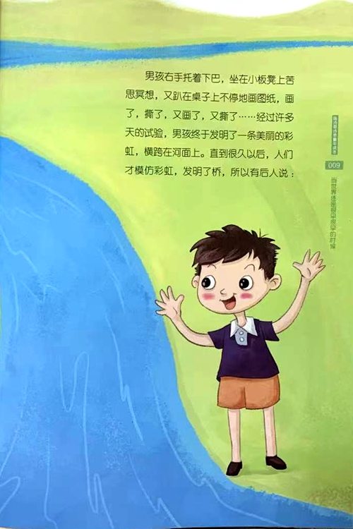 男孩右手托着下巴,坐在小板凳上苦思冥想,又趴在桌子上不停地画图纸,画了,撕了,又画了,又猫了……经过许多天的试验,男孩终于发明了一条美丽的彩虹,横跨在河面上。直到很久以后,人们才模仿彩虹,发明了桥,所以有后人说: