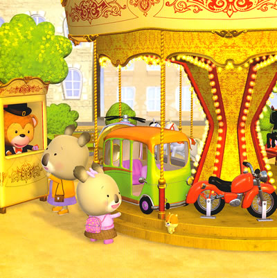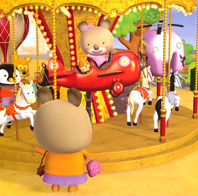 放学回家的路上,考拉宝宝和小仓鼠皮皮路过旋转木马。哈哈,妈妈同意让他们坐一圈。两个小家伙能不能抓到绒球呢?