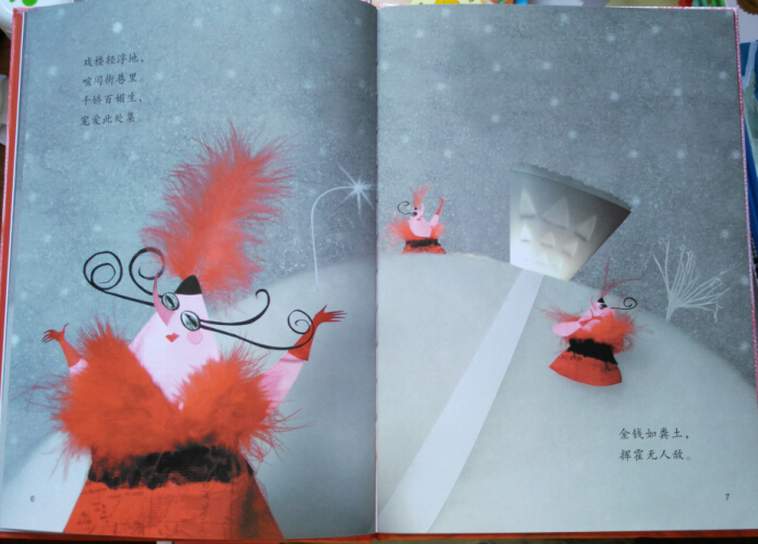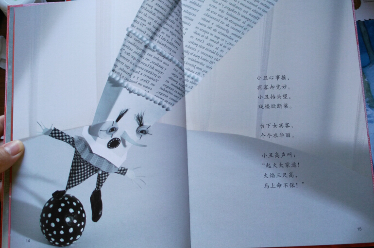 《火焰》故事源自丹麦哲学家克尔凯郭尔一则充满反讽意味的寓言:一场大火在某戏楼的后台突发。一个在台上表演的小丑发现后立即通知观众,众人却认为那只是一个笑话并鼓掌喝彩。小丑重复了他的警报,众人却喧哗得更加热闹。故事采用戏文的韵律和节奏,夸张而变形的剪贴画构图,深刻揭示了“善言不珍惜、恶果躲不掉”的道理。