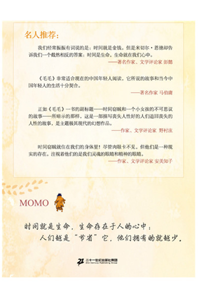 故事发生在很久以前,在一个王宫耸立、殿宇纷繁的大城市,来历不明的女孩毛毛突然出现在人们的生活中。她虽然住在圆形废墟广场,却得到善良人的帮助,成了大家的好朋友,渐渐成为人们的倾听者。然而,一群西装革履的灰先生打破了城市的平静,人们慢慢变得焦躁,生活节奏紊乱,为了所谓的合理化,甚至放弃爱与被爱的时间,机械地生活着。当整个城市被灰色笼罩,只有毛毛依然守在废墟广场等待朋友的到来,并组织小朋友们抵抗灰先生的入侵。可毛毛也因此成为灰先生们的敌人而陷入危险之中,这时,毛毛得到了小乌龟和时间掌控者候拉的帮助,利用时间花打败了时间盗贼灰先生,帮人们夺回了被盗走的时间。