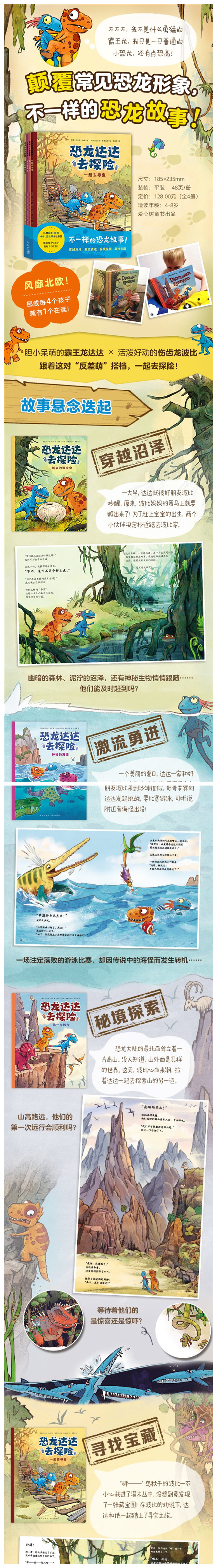 不一样的恐龙故事!风靡丹麦、瑞典、冰岛、芬兰等北欧各国,挪威每4个孩子就有1个在看! 穿越沼泽、激流勇进、秘境探索、寻找宝藏……在故事中收获爱与友谊,和小恐龙们一起成长! 霸王龙也会胆小?超萌反差,带来欢乐不断!鲜明而立体的人物性格,贴近儿童心理,让孩子倍感亲切。 恐龙形象高度拟人,可爱灵动、充满趣味;图画细腻生动、细节满满,打造动画片般的阅读体验! 还原恐龙的形态细节与生活习性,书后附有知识拓展,满足孩子对恐龙的好奇。 语言幽默流畅、文字量适中,更适合用作桥梁书,让孩子在奇妙的故事中爱上阅读!