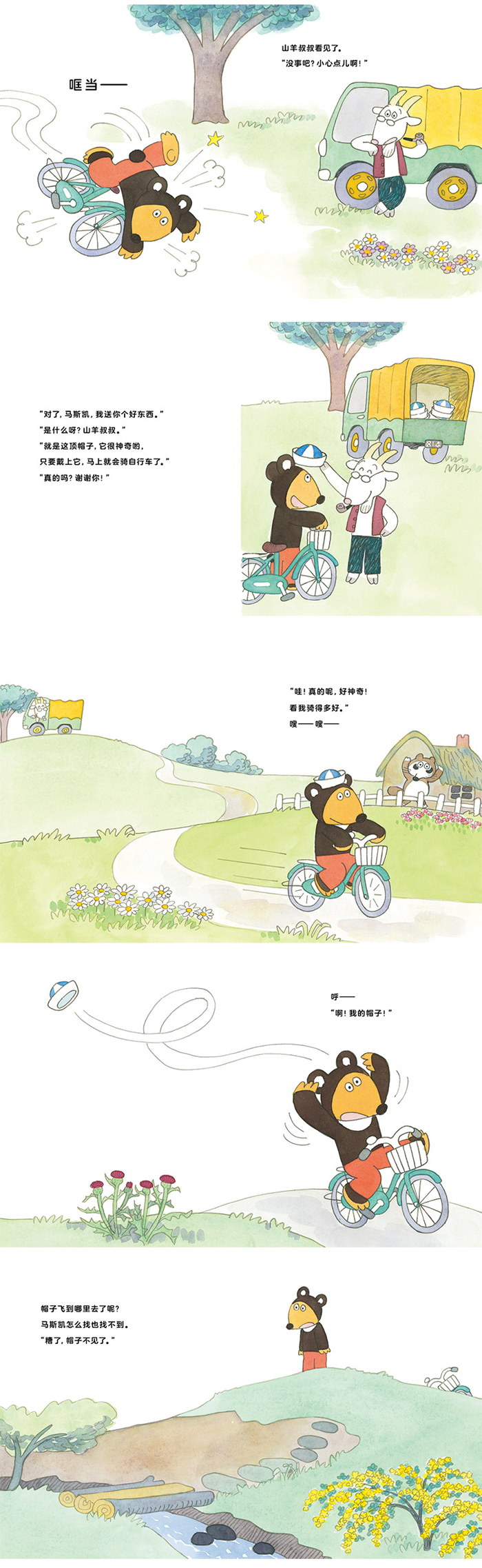 小熊马思凯开始练习骑自行车。晃晃悠悠、晃晃悠悠…… 怎么也骑不好。山羊伯伯看到了,给了它一顶不可思议的帽子,并告诉它戴上这个就会骑自行车了!马思凯戴上了帽子,真不可思议!真的自行车会骑了。但大风却吹走了帽子。