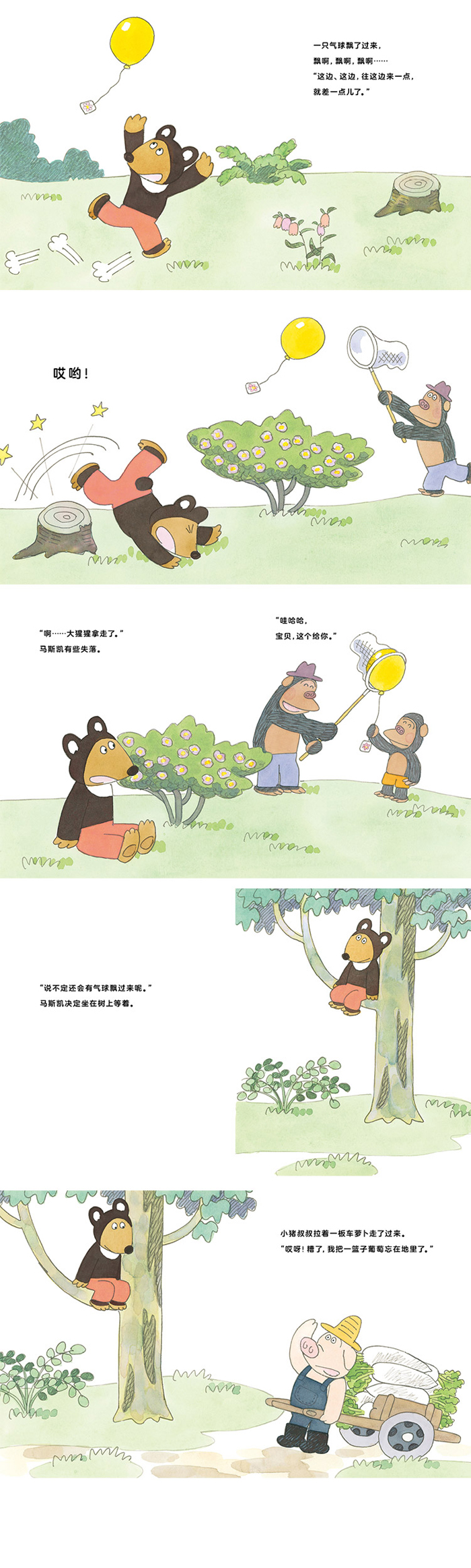 小熊马思凯在草地上玩耍,看到一只气球飘了过来。为了捉住气球它使劲的去追。但很遗憾没有追上气球。不放弃的马斯凯爬到了气球飞过的树上去等。