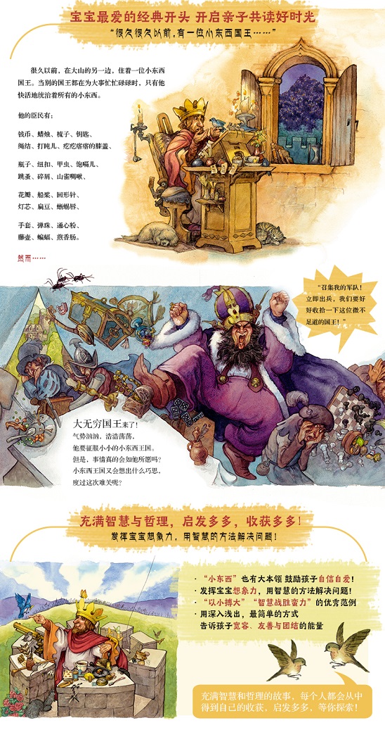 很久很久以前,在一个遥远的国度,小东西国王快乐地统治着从纽扣到甲虫,从弹球到通心粉——世上的一切小东西。当大无穷国王攻城略池、称王称帝之际,他愤怒地发现还有个小东西国王没归顺于他。“谁都知道小东西天生就是为大东西服务的。”他说。你支持大无穷国王的做法吗?大无穷国王能战胜小东西国王吗?这场战争到底会多有趣呢?你看了就知道!