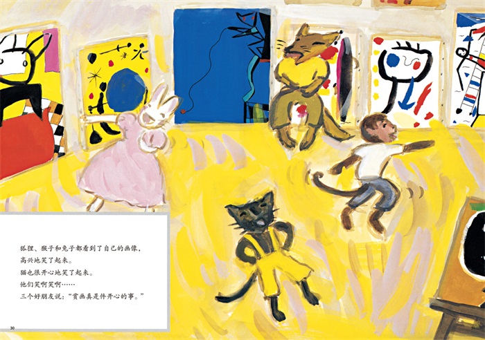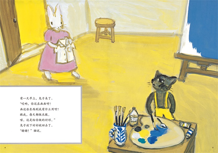 这本书讲的是喜欢画画的猫和他的朋友之间的故事。猫很喜欢画画,每天都在家里画许许多多的话,但是朋友们不理解为什么猫每天都在画画,小兔子来送衣服、狐狸来送鱼、猴子来修椅子的时候,都忍不住要提出质疑:画画究竟有什么用呀?虽然每天都要面对朋友们的不理解,但是猫仍然每天坚持做着自己喜欢的事。偶然在一个下雨天,小伙伴们觉得很无聊,于是决定去看看猫画的画,四个人一边喝茶一边赏画,度过了愉快的一天。猫的创作得到了朋友的认可,猫自己也觉得“喜欢画画并且画得很好,真的是一件很棒的事”