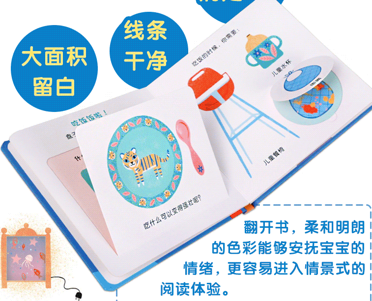 这本书由宝宝日常散步、吃饭、洗澡、睡觉共四幅日常生活场景和让宝宝在房间里辨认日常生活用品的图景构成,翻翻页之中是介绍了每宝宝在每个生活场景下应该怎样做,引导宝宝建立健康快乐的生活方式,另外还拓展了一些对日常生活用品及其用途的介绍,贴近宝宝生活。宝宝转动转盘切换小夜灯的图案和放置日常生活用品,增强互动性,引导宝宝动手动脑,整套书画风清新唯美、配色温和舒适,培养宝宝的审美能力。本套书一共有四册,分别是《好玩的车车》《吃饭饭》《穿衣服》《宝宝的一天》。