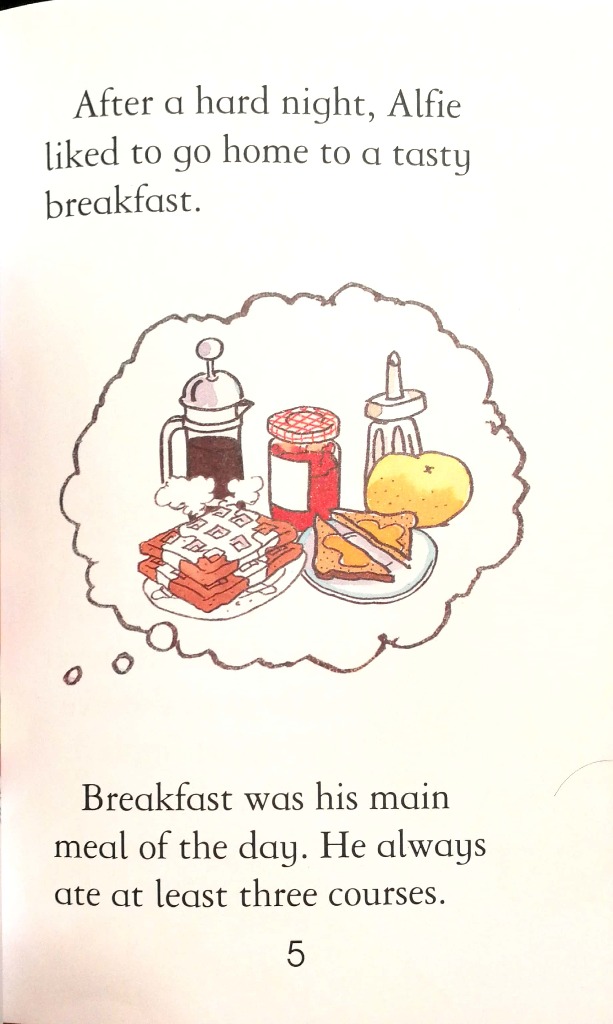 Alfie Briggs is a burglar.After a hard night's thieving,he likes to go home to a tasty meal.But one dayAlfie returns to find his cupboards bare. Someone has burgled his breakfast!