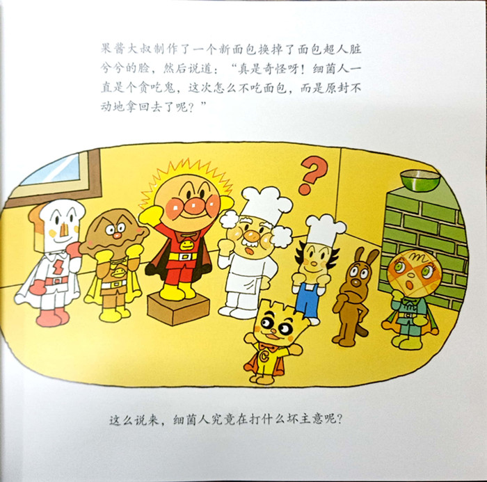 【内容】 面包超人是制作面包的果酱大叔所做出的红豆面包,因刚好生命之星坠落在面包上而诞生。有,面包超人发现只要帮助别人,内心就会变得暖呼呼的。此后,面包超人为了能在有人需要的时候伸出援手,他开始每天都在街上巡逻,遇到肚子饿的人也会将自己的脸分给他们吃。 但是,在面包超人诞生的同时,细菌人也诞生了。细菌人为了打败他的宿敌面包超人来到了这个星球。而且细菌人总是爱恶作剧,让大家感到很困扰。面包超人世界中的角色都各具特色,每一本书中的角色和故事都很好热闹且欢乐。