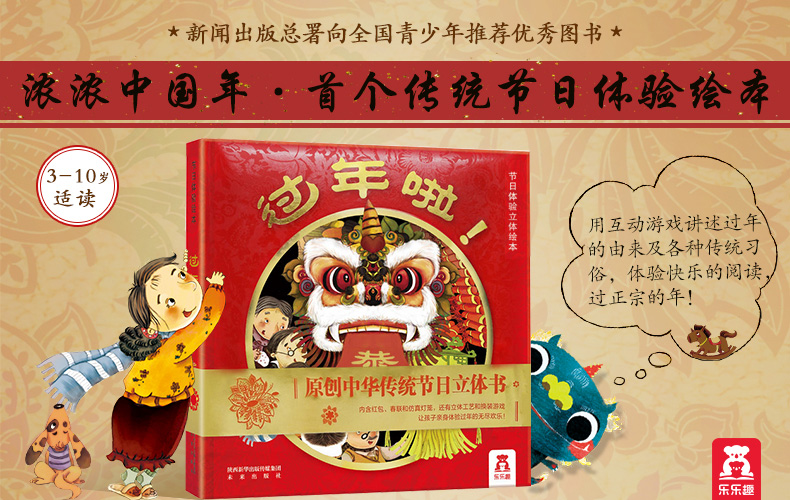 这是本很好的精美之作,用非常贴近生活的文字向孩子们介绍了年的传说,过年的风俗. 除了立体模型,还有不少互动环节。比如,贴春联,比如给小朋友开衣柜换新衣等等,非常引人入胜。我一把书拿给孩子,他就开心地玩个不停,反复要求妈妈讲!强烈推荐!