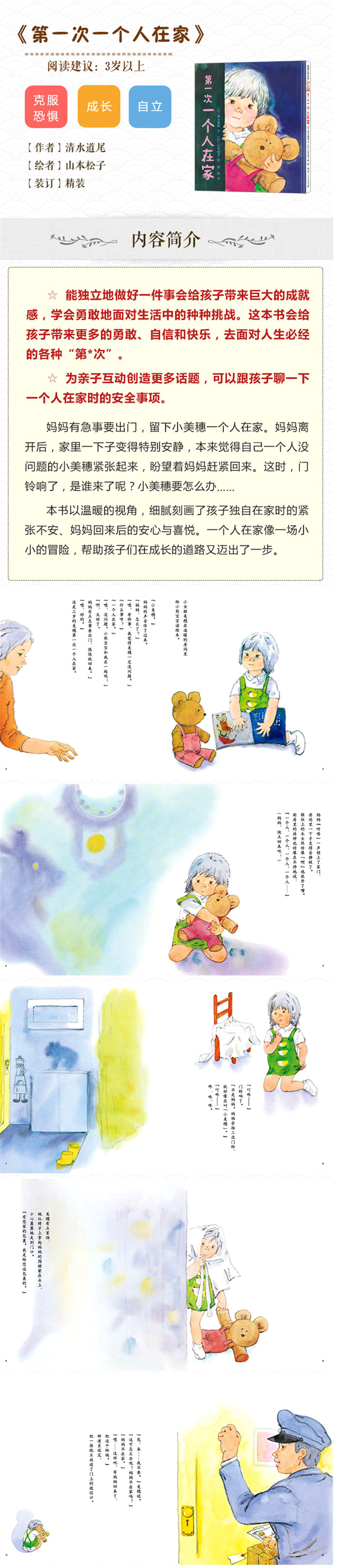一个人在家时的安全事项妈妈有急事要出门,留下小美穗画个人在家。妈妈离开后,家里一下子变得特别安静本米觉得自己一个人没问题的小美穗紧张起来,盼望着妈赶紧回来。这时门 铃响了,是谁来了呢?小美穗要怎么办本书以温暖的视角,细腻刻画了孩子独自在家时的紧 张不安、妈妈回来后的安心与喜悦在家像一场小戏书小的冒险,帮助孩子们在成长的道路又迈出了一步