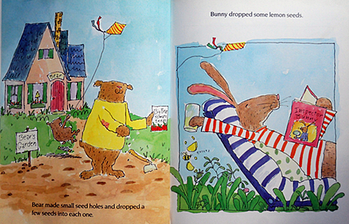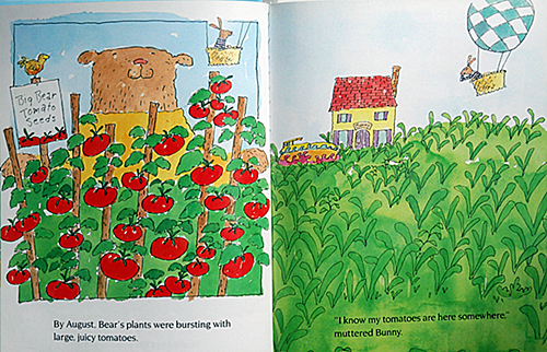In spring,Bear began by digging a place for his tomato garden.Bunny didn't want to waste time preparing anything. He poured his packet of seeds on the hard,weedy ground.