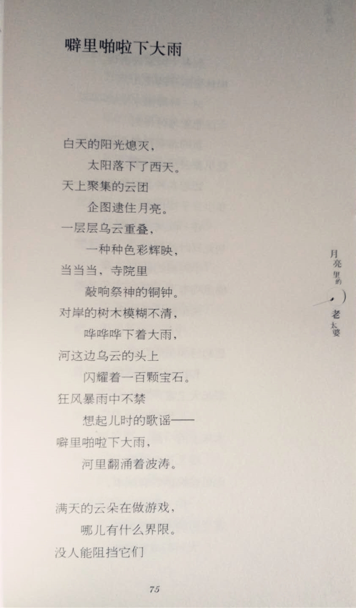 《月亮里的老太婆——泰戈尔诗歌精选·儿童诗》是外研社《泰戈尔诗歌精选丛书》的分册,主题为儿童诗。泰戈尔先生是全世界最伟大的诗人之一,他以72年的诗龄,为全世界读者创作了50多部诗集。在此之前,中国读者所接触到的泰戈尔诗歌大多是从英语翻译而来的,但是我们知道泰戈尔先生是用孟加拉语创作的,虽然英译诗歌也有其独特的韵味,但这就如同是一道美味,却多了一道咀嚼程序,其中的滋味难免有一些流失。