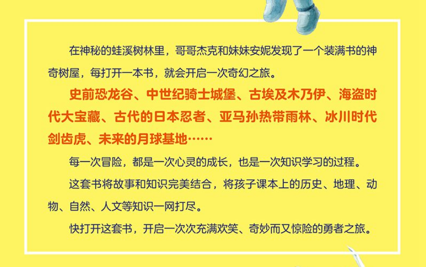 《神奇树屋》主题包罗万象,什么都有,而且是一种探险类的冒险类的小说,百科知识类加探险类冒险类正式这个年龄的孩子,*喜欢阅读的内容。 ——李一慢(知名儿童阅读推广人、前新阅读研究所研究员)