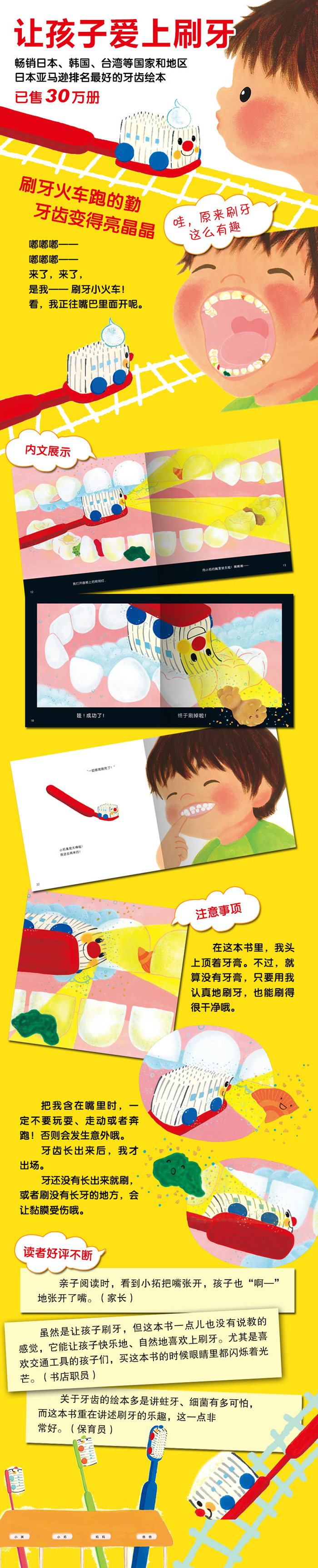 ★ 让孩子爱上刷牙 ★ 刷牙火车跑得勤,牙齿变得亮晶晶 几乎每个孩子都知道爱护牙齿的重要性,但每次刷牙时喜欢跟家长玩藏猫猫的孩子也不在少数。有些孩子对刷牙有恐惧心理,有些孩子觉得刷牙只是一项机械、无趣的任务,这样自然会心生排斥。试想,如果把刷牙变成一项有趣亲子互动游戏,逐渐消除孩子对牙刷的排斥感,那么孩子也不会那么抵触刷牙了。 可以这么说,只有不喜欢刷牙的孩子,却没有不喜欢交通工具的孩子,本书正是从这一点出发,把头顶牙膏的牙刷比喻成可爱的小火车,把牙齿比作车站,“刷刷刷”的刷牙声比作火车前进时发出的“嘟嘟嘟”声。这一创意把孩子们不喜欢但又不得不做的日常“任务”瞬间变成开火车游戏,“嘟嘟嘟”等众多火车前进时的拟声词的运用也增加了刷牙的乐趣,有助于拉近孩子和牙刷的距离,让孩子自然地、快乐地接受牙刷,进而培养孩子良好的刷牙习惯。 本书还提到孩子刷牙时的一些注意事项,全面又贴近孩子的生活。日文版上市两月内加印3次,并畅销韩国、台湾等国家和地区。 希望每个看过此书的孩子都爱上刷牙,享受刷牙! 亲子阅读时,看到小拓把嘴张开,孩子也“啊—”地张开了嘴。(家长) 虽然是让孩子刷牙,但这本书一点儿也没有说教的感觉,它能让孩子快乐地、自然地喜欢上刷牙。尤其是喜欢交通工具的孩子们,买这本书的时候眼睛里都闪烁着光芒。(书店职员) 关于牙齿的绘本多是讲蛀牙、细菌有多可怕,而这本书重在讲述刷牙的乐趣,这一点非常好。(保育员)