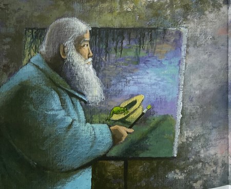 谁说莫奈从来没有在吉维尼花园里画过动物?他画的安东妮——池塘边的小雨蛙,就是一幅名画!可谁知道,夏夜里的一个吻,居然让这幅名作消失啦!这可怎么办?可小安东妮并不知道,这位漫步花园的白胡子老爷爷,看看这边的鸢尾,看看那边的睡莲,悠闲地抚摸花瓣,望望天空……一幅幅充满生机的画,就这样留在了莫奈爷爷的眼中,和心中。