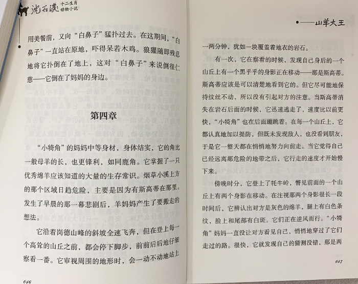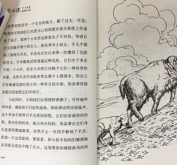 在这本书里我们会读到关于羊的精彩故事。“世界动物小说大王”—加拿大西顿的《公羊克拉格》讲了一个名叫斯高蒂的猎人与一只名叫克拉格的大角山地绵羊之间长达十余年的恩怨情仇。母羊和小羊接二连三地倒在血泊中,公羊克拉格在苦水中淬炼,在艰辛中砥砺,在磨难中成长,也终于成为闻名遐迩的“ 神羊”。结尾,作家西顿也想告诉人们:人类有能力毁掉大自然的杰作,但永远无法征服高贵的灵魂。藐视大自然者,心灵永无安宁。