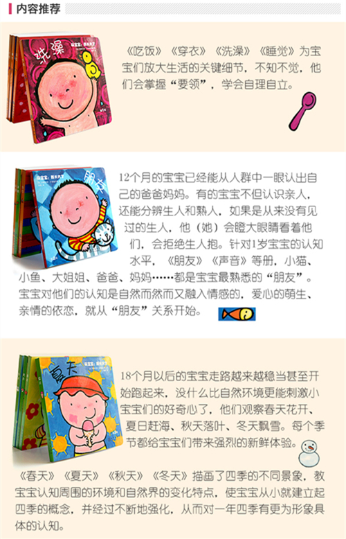 18个月以后的宝宝走路越来越稳当,甚至开始跑起来,因此带宝宝到户外的机会越来越多。没什么比自然环境更能刺激小宝宝们的好奇心了,他们观察春天花开、夏日赶海,秋天落叶、冬天飘雪。每个季节都给孩子们带来强烈的新鲜体验。《萌宝宝:我长大了》系列丛书描画了四季的不同景象,教宝宝认知周围的环境和自然界的变化特点,使宝宝从最初就建立起四季的概念,经历以后不断的强化,从而对一年四季有更为形象具体的认知。