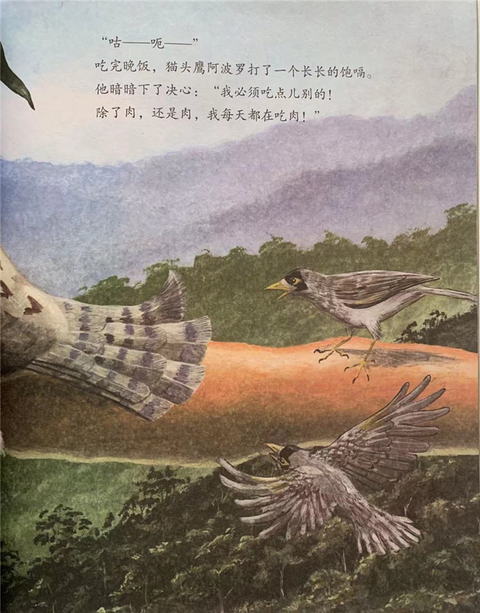 猫头鹰阿波罗每天都在吃肉。他发现森林里其他动物都跟自己吃的不一样,蜜雀吸食花蜜,鹦鹉吃种子和坚果,袋鼠爱嚼青草,老牛喜欢干草。关键是那些动物都躲自己远远的,让他感到很孤单。所以,他决定改变一下自己的饮食习惯。他尝试吃花蜜,吃豆荚的种子,吃树下的青草,没想到肚子咕咕地叫,感到很不舒服,还浑身没力气。他不得不去请教智者老猫头鹰威尔弗雷德。智者列举了三大理由,告诉他猫头鹰不是吃素的否则后果不堪设想。