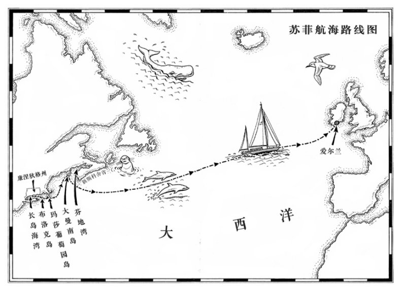 苏菲一心向往大海,仿佛听见了大海的召唤(可她又不时地做着一个被海水淹没的恶梦)。终于,她登上“远航者”号,与三位舅舅和两位表哥一起开始了航行。他们要从美国东海岸出发,跨越大西洋前往爱尔兰,去看望外公博比。