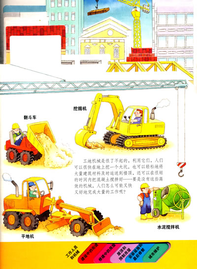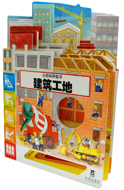 《小百科异型书:建筑工地》引自意大利的异型小百科书。独特的造型,给孩子们直观的表达出了书中的主题:在钢筋水泥的城市里,有着许多的“建筑工地”,有不同的机械、不同的职位,在里面宝宝会知道一栋大楼是如何建造起来的。