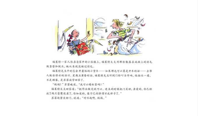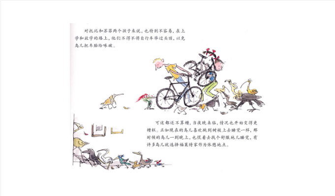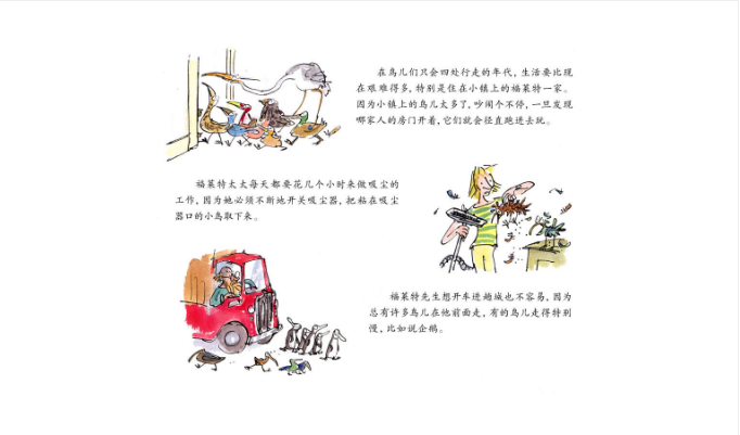 很久很久以前,鸟儿们并不会飞,也是在地面四 处行走。太多鸟儿了,地面拥挤不堪,行走都很困难 。鸟儿们还常跑进房屋里捣乱,人们烦恼不已。福莱 特一家也深受鸟儿们的困扰,他们决定想办法解决这 个难题。聪明的福莱特先生发明了一种飞翔机,这样 他们一家人就可以不走拥挤的地面了。他们也没想到 ,鸟儿们跟着学习,飞向了空中……