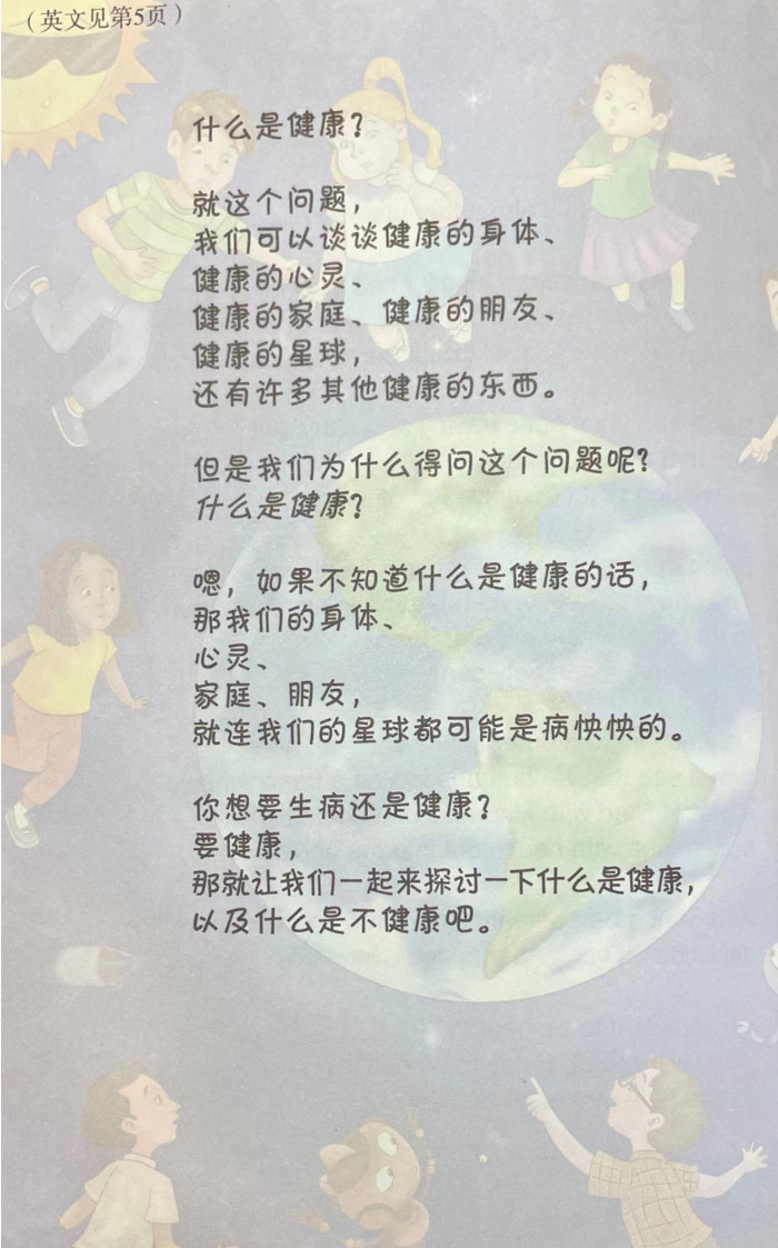 作者以优美的文字引导小读者认识怎样保持身体健康、思想健康,如何建立健康的人际关系,什么是健康的社会大环境。作者在简单易懂、轻松幽默的文章中设计了一些问题,借以激发小读者积极思考、鼓励小读者与家长或者老师探讨“什么是健康”这个看似简单实则深刻的问题。