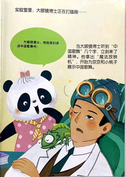 实验室里,大眼镜博士正在打瞌睡…… 太棒啦! 讲中国歌舞吧! 大眼镜博士,快给我们讲 当大眼镜博士听到“中 国歌舞”几个字,立刻来了精神。他拿出“魔法放映机”,开始为京京和小桃子展示中国歌舞。