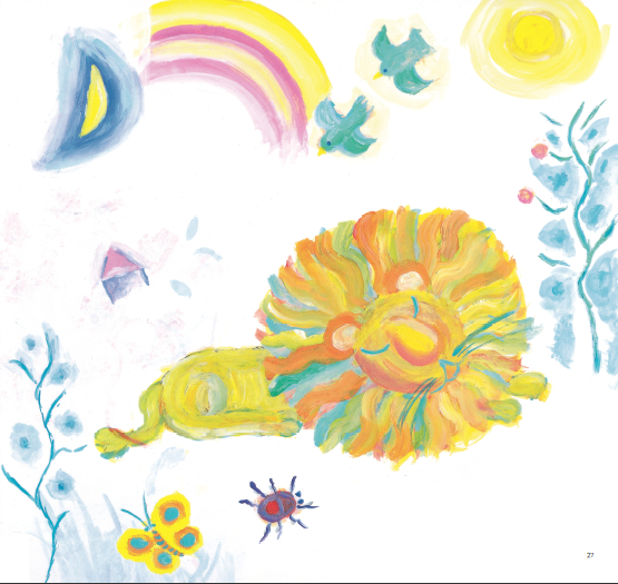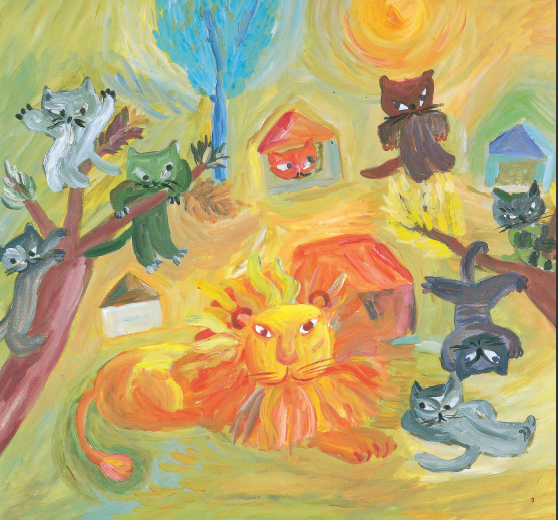 但与《活了100万次的猫》中那深刻而永恒的爱不同,在《飞上天空的狮子》中,佐野洋子对爱进行了更为深入地思考。她在书中塑造了一头温柔强大的狮子,它和一群敬慕它的小猫生活在一起。为了报答小猫对自己的喜爱和敬慕,狮子不辞辛劳地为小猫服务,可小猫却无法理解狮子的真实想法,它们只是理所当然地以为狮子永远强大而且不知疲倦——但显然,这不可能。于是,悲剧注定发生。