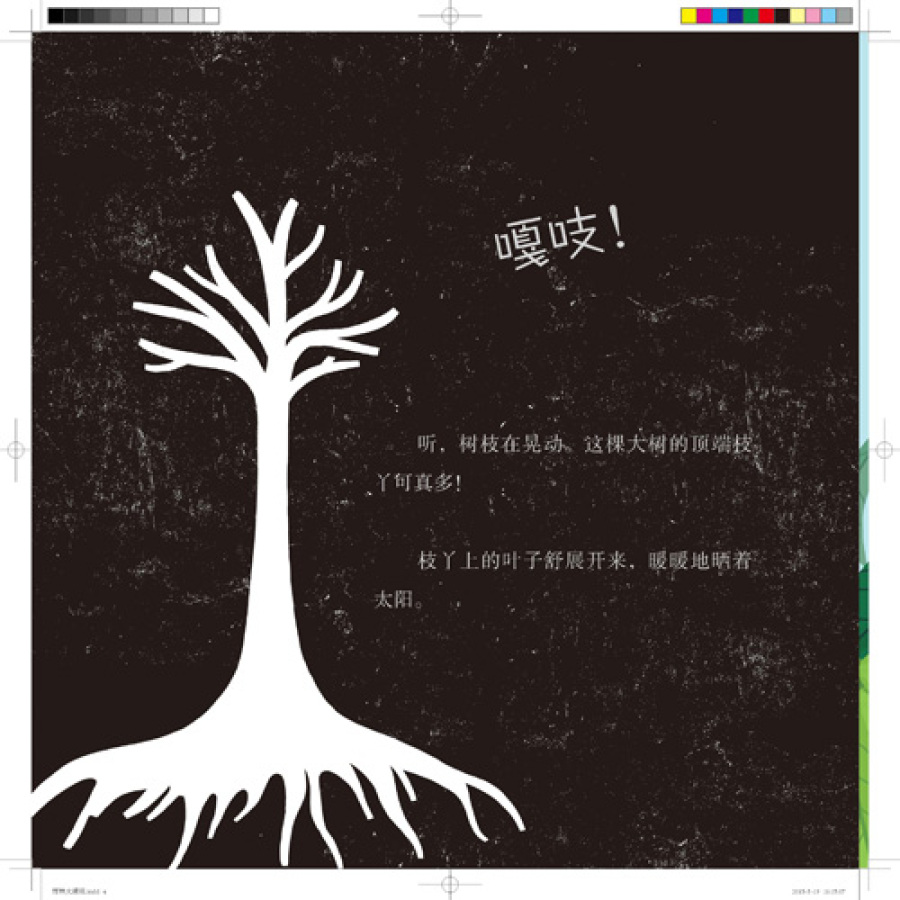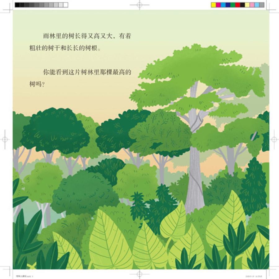 树蛙带着它的蝌蚪宝宝,住在色彩艳丽的植物体内;美洲豹悄悄地躲在蕨类植物下,等待捕食;树懒倒挂在树枝上,悠闲地打起了哈欠;一队切叶蚁迈着整齐的步伐,朝蚁巢行进……在彩页的背面打亮手电,或者把这一页对着光源看,你就能透视这个热闹的小世界啦!