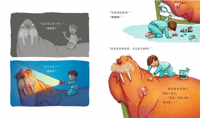 弗里恩对海象照顾得无微不至,他怎么会这么懂事呢?别忘了,孩子的行为都源于父母的表现。每一天,弗里恩都应该感受着父母的温柔陪伴。爸爸妈妈似乎不那么相信有海象,但他们依然温柔地容忍着,适度地帮助着,带着尊重和信任,让弗里恩用他自己的方式去解决问题。