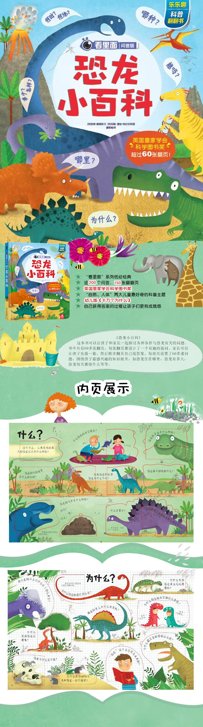 这本书可以让孩子和家长一起探讨各种各样与恐龙有关的问题。书中共有60多张翻页,每张翻页都设计了一个有趣的提问。家长可以让孩子先猜一猜,然后掀开翻页自己找答案。每册共设置了60多道问题,围绕孩子最感兴趣的知识展开,如恐龙住在哪里,恐龙有多大,恐龙每天都做什么等等。