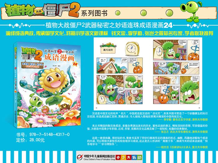 本系列图书以“植物大战僵尸2”游戏中的植物和僵尸形象为主角,采用漫画的形式,演绎中国经典成语故事,对接小学语文新课程标准,让孩子在哈哈大笑中学习成语知识。本套装共24册,涵盖小学语文课本中出现的大部分成语。每本书包括36个成语故事,用诙谐幽默的方式讲解成语的含义和用法,让读者易于理解又印象深刻。书中还附有成语的释义、造句、近义词、反义词、出处、典故等,方便读者对成语进行更深入的理解和运用。现在就跟随本书,进入博大精深、妙趣横生的成语世界吧!………………