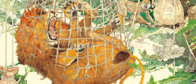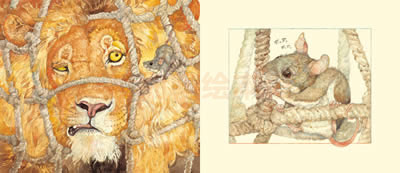 《狮子和老鼠》也被称作《狮子和报恩的老鼠》,出自世界上最早的寓言故事集《伊索寓言》。这部作品原本的故事是这样的——狮子睡着了,有只老鼠跳到了他身上。狮子猛然站起来,把他抓住,准备吃掉。老鼠请求饶命,并说如果保住性命,必将报恩,狮子轻蔑地笑了笑,便把他放走了。不久,狮子真的被老鼠救了性命。原来狮子被一个猎人抓获,并用绳索把他捆在一棵树上。老鼠听到了他的哀嚎,走过去咬断绳索,放走了狮子,并说:“你当时嘲笑我,不相信能得到我的报答,现在可清楚了,老鼠也能报恩。”