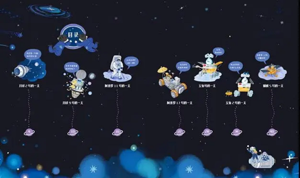 “太空的一天”系列以太空中的“一天”为时间线,给读者讲述了20 余个航天器在太空中的一天的故事。本套书为孩子呈现了浪漫、广袤又充满神秘的宇宙画卷,用拟人化的手法展现了在太空中工作和旅行的航天器角色,用故事串联起航天科普知识,让孩子在唯美清新的插画、幽默风趣的故事中学习前沿的科学文化知识。 《月球漫游的一天》讲述了月球2号、月球9号、阿波罗11号、阿波罗17号、嫦娥3号、嫦娥4号、嫦娥5号对月球的探测活动。