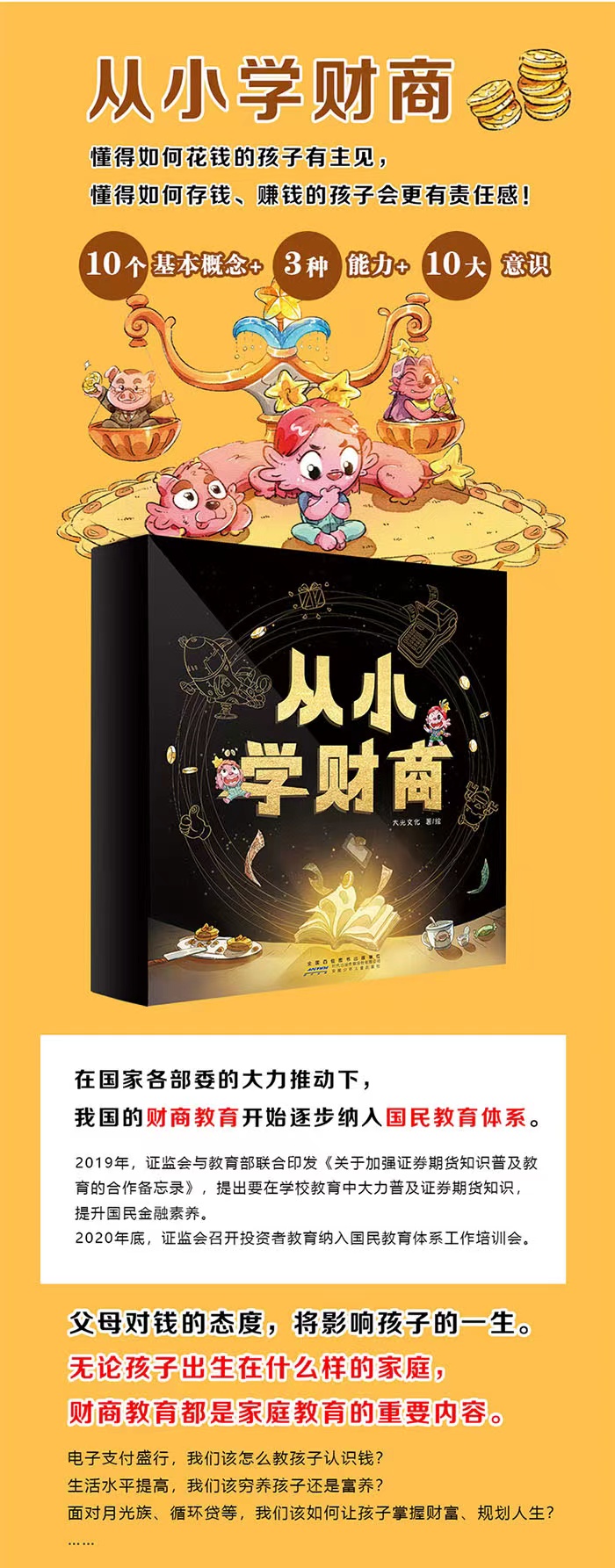 从小学财商是关于财商启蒙和培养的功能性图画书,以3-6岁幼儿为读者对象,共10册。分别是《1外星人也需要钱·钱的用途》《2爸爸是个大忙人·如何赚钱》《3职业梦想大作战·职业规划》《4爷爷的礼物泡汤了·交易方式》《5种下一棵金钱树·虚拟货币》《6信用也能当钱花·个人信用》《7一夜变成大富翁·防范骗局》《8我全部都想买·财务规划》《9蛋糕店的大麻烦·计算成本》《10钱不是万能的·金钱观念》。 外星人西西一家因意外迫降地球,为了更快更好地适应地球生活,他们必须了解我们当下的货币流通法则和金融行为,也因此发生了很多温馨搞笑的故事。本套书通过10个贴近生活的小故事,讲述了交易方式、存钱、记账、预算、信用、虚拟货币等10个核心的财商概念,旨在帮助小朋友对基本的金融法则和当下流行的交易方式建立认知,于潜移默化中培养认识财富的能力、运用财富的能力和创造财富的能力,树...