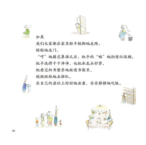 这是一本充满教育意义的绘本,围绕一个小女孩的日常生活,涉及到生活中许许多多的公共陋习,比如说使劲儿关门,在公共场合大声说话,随手扔垃圾,随意插队,半夜在楼上蹦蹦跳跳……许许多多孩子小的时候可能会做出的行为,有的时候,如果你只告诉孩子这不对,不应该这么做,幼小的孩子可能很难理解,这本绘本通过故事的形式,讲述了为什么这样做不对,这样做会给别人带来什么影响,会给自己带来什么不好的后果。用孩子们能够理解的方式告诉孩子们哪些陋习是不应该的。有趣的故事,讲起来毫无说教感。是非常有实际指导意义的一本行为准则绘本。