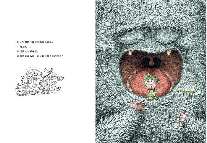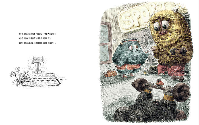 有趣的是,当代表现实规则和理性的高大威严(只有四条腿看不到上半身)的父母出场收束故事时,作者并没有让这个幻想游戏立即结束,而让小怪兽对自己的父母说了一模一样的话,之前几乎全部左黑白文字结合小画面(现实)、右彩色大画面(幻想)的页面设计也同时反转。这个巧妙的尾声亦真亦幻,给孩子们留下了想象的空间:妖怪的爸爸妈妈也会像我的爸爸妈妈一样吗?我想,凡是读过这本《柜子里真的有妖怪》的父母应该是一样的:他们会理解柜子对于孩子的意义,他们会智慧地帮助孩子和妖怪共处,他们也会耐心地等待孩子和妖怪说再见。他们一定都会接受并爱这并不完美的孩子——无论他们是人类还是“妖怪”。