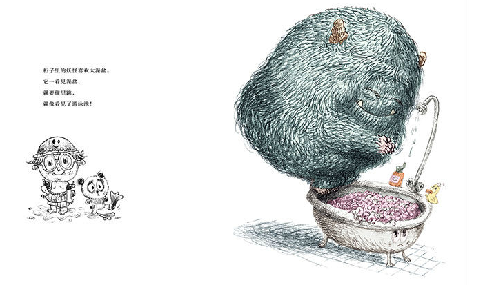是啊,这个柜子里的小家伙怎么能不好玩呢?彩铅和颜料勾擦出毛绒绒的外表、丰满到几乎“爆炸”的肉球状造型、不成比例的短小四肢和惊人的大眼睛、总是憨憨傻傻的表情,组合成人畜无害、蠢萌丑趣的卡通形象,完全背离了我们对妖怪的传统想象。而这只小妖怪的行为也更加“出格”,不再是残害生灵、邪恶可怕的异类,而是和孩子一样喜欢玩玩具、调皮捣蛋、特别闹腾还怕黑的家伙。