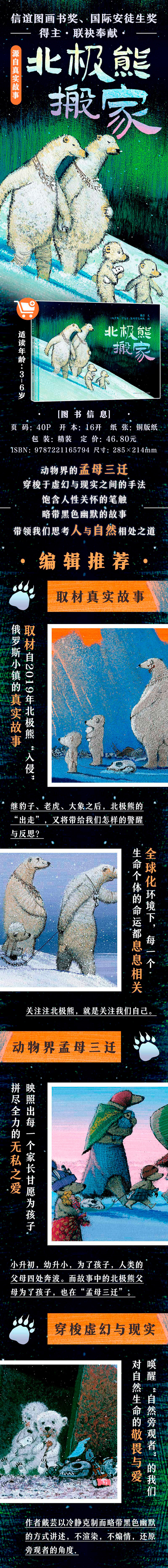 在遥远的极寒之地,也有这样一对北极熊父母。为了寻找适宜的生存环境,他们带着年幼的孩子,踏上了茫茫迁徙路。从晦暗的人类小镇,到吃喝不愁的动物园,从远古的冰河世纪,到万里高空的月球……历经追寻与探索,北极熊们终发现了一个的新家。那里的冰川很高,那里的风雪好大,那里的海豹肥美——一切的一切,都和他们梦中的老家一样。只是,那样一个地方,究竟是哪里?他们又能否到达? 这是虚构的故事,更是迫在眉睫的现实。