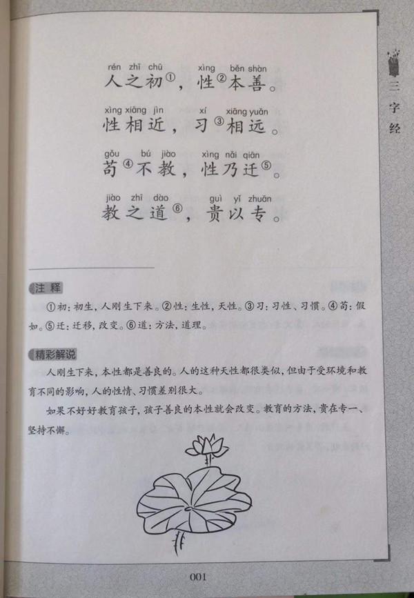 《三字经》产生于南宋,距今已有700多年的历史,是广为流传的传统蒙学读本,是影响极大的儿童启蒙课本。全书共1000多字,三字一句的韵文极易成诵,内容非常丰富。不论是天文地理、社会家庭,还是历代兴衰、文化变迁,都在其中得到反映;书中更包含了传统伦理道德的精华,阐述了丰富深刻的人生哲理,广泛生动而又言简意赅。全书三字一句,两句一韵,读起来朗朗上口,易诵易记。中华国学启蒙经典诵读,让孩子在传统文化的滋养下学习做人的道理,塑造好的品格!