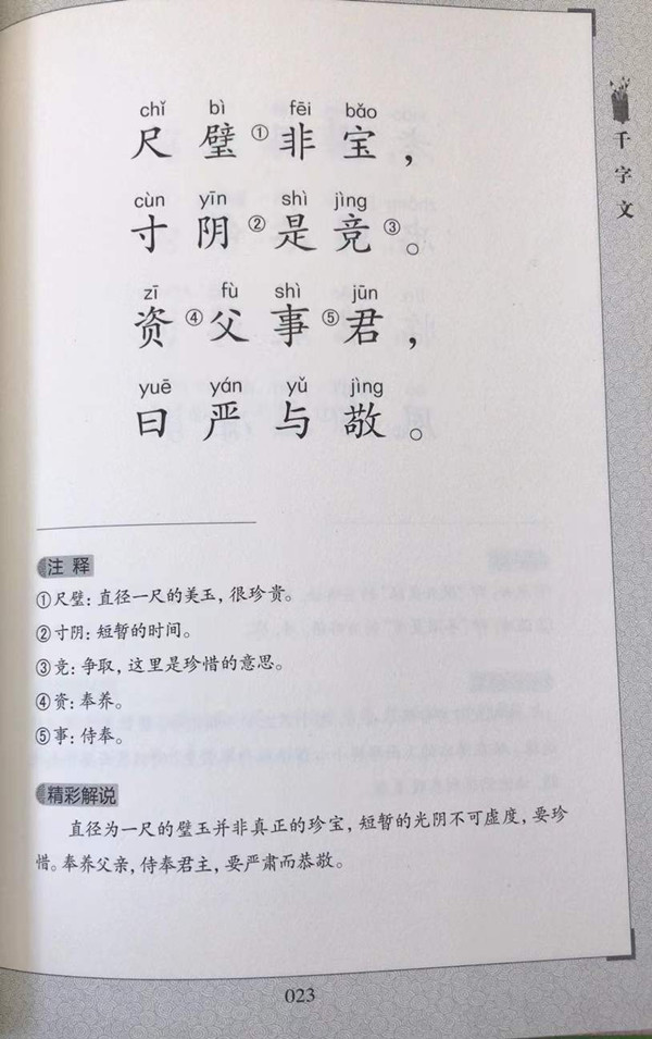 《千字文》是由“天地玄黄”到“焉哉乎也”,总共250个隔句押韵的四字短句构成,成文于六朝,距今已有1400多年的历史。内容包含天文、地理、政治、经济、社会、历史、伦理,熔各种知识于一炉,并通篇贯穿以统一的思想,脉络清晰,整篇文章一字都不重复,虽然不多,但是包罗广泛,对儿童认知有很好的作用。且千字文以其特有的形式展现汉字,对每一个汉字来说,文字既体现其含义(训),也体现声音(音),构思巧妙,寓意于理,是用来教授儿童基本汉字之重要启蒙读物,和《三字经》、《百家姓》合称“三百千”。