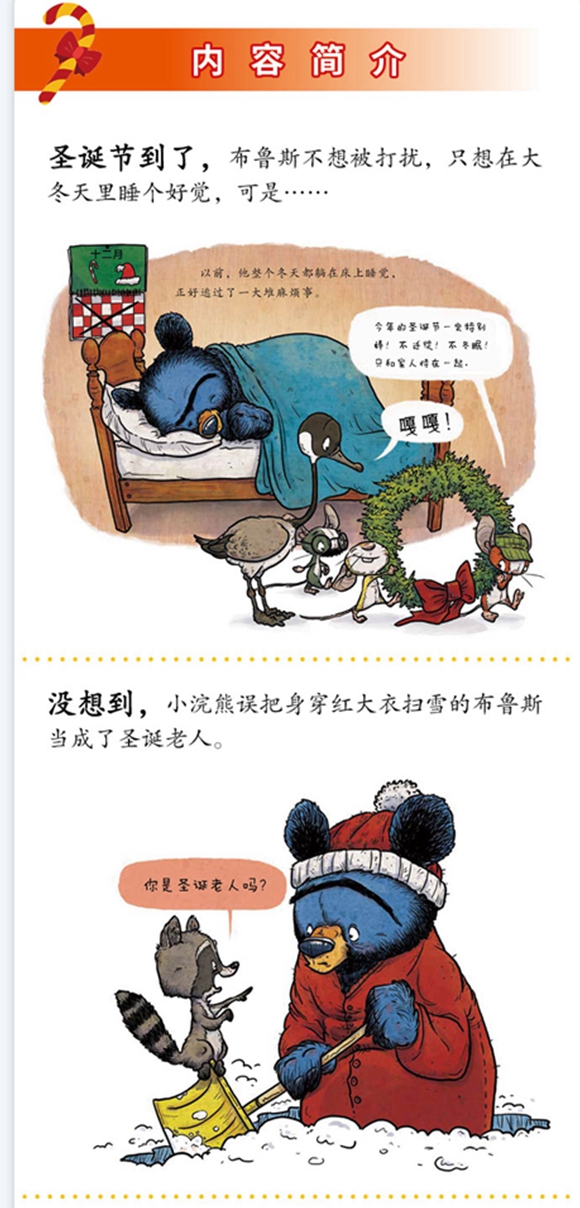 圣诞节到了,布鲁斯只想在大冬天里睡个好觉。没想到,小浣熊误把身穿红大衣扫雪的布鲁斯当成了圣诞老人,呼朋唤友地叫来众多森林伙伴,挤在布鲁斯家里许愿要礼物。布鲁斯烦闷又无可奈何,不得不扮成圣诞老人,没想到大家因此一起度过了一个热闹非凡、激动人心的圣诞节。