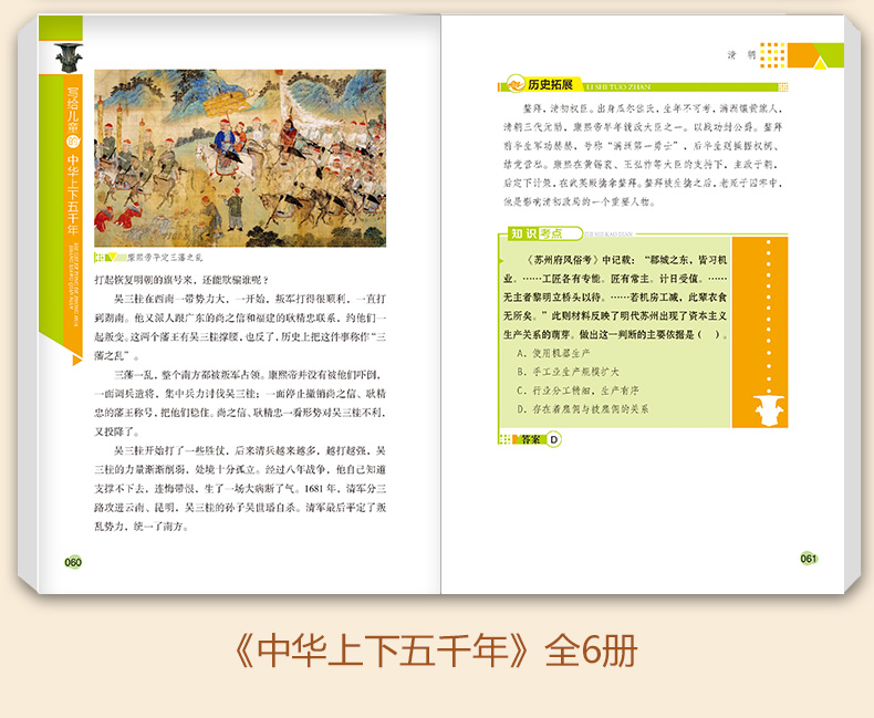 中华上下五千年(少年彩图版)专为广大小学生读者量身定制。全书以历史编年为经,以各个时代影响社会历史进程的重要人物和事件为纬,内容涉及政治、军事、经济、文化、外交、科技、艺术、民俗等诸多方面。全书共分6卷,上起神话传说时代,下迄清王朝结束,选取了300余个主题,1000余幅图片,生动、真实、客观、全面地再现了中国历史的精彩瞬间和丰富内涵。生动流畅的文字、异彩纷呈的图片、新颖活泼的版式、精美考究的装帧设计,使广大小读者在获取知识的同时,尽享全新的阅读感受。