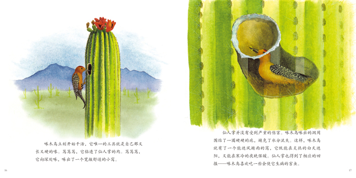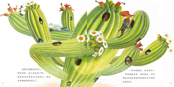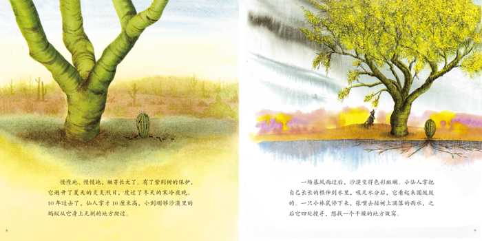 本书语言优美平实,图画灿烂热烈,真实地呈现了壮美的沙漠景观。仙人掌的生命历程充满艰辛,却又令人着迷和敬畏。自然界里的生命网复杂交织,而我们又何尝不是如此?相信这本意境深远的书能在每个孩子心中引发感动与思考。