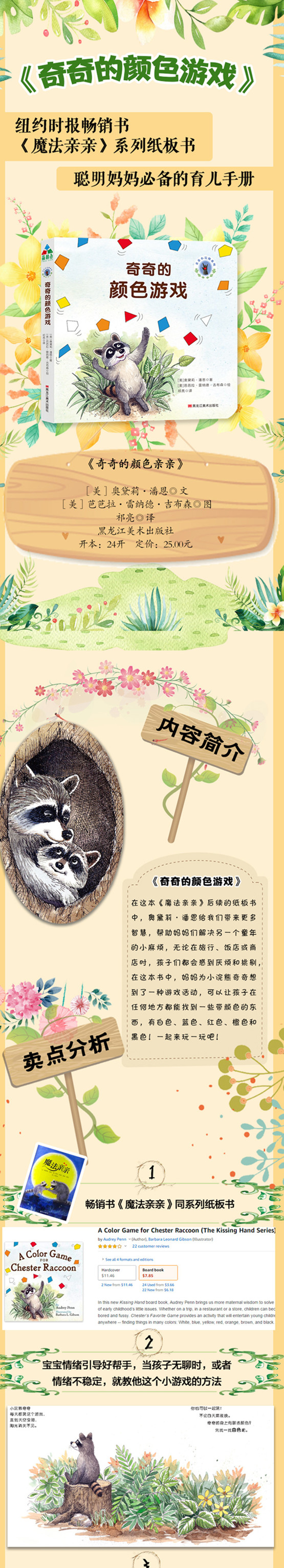 奇奇的颜色游戏在这本《魔法亲亲》后续的纸板书中,奥黛莉·潘恩给我们带来更多智慧,帮助妈妈们解决另一个童年的小麻烦,无论在旅行、饭店或商店时,孩子们都会感到厌烦和挑剔,在这本书中,妈妈为小浣熊奇奇想到了一种游戏活动,可以让孩子在任何地方都能找到一些带颜色的东西,有白色、蓝色、红色、橙色和黑色!一起来玩一玩吧!