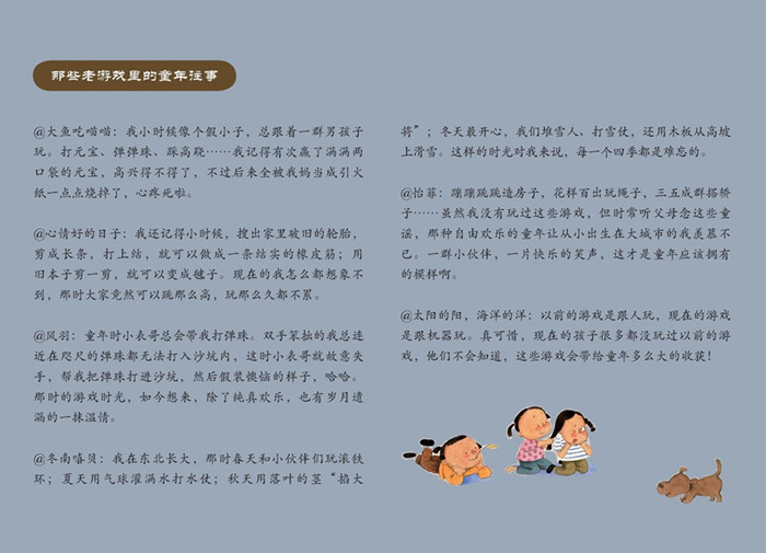 我出生在一个美丽的小乡村,那些珍藏的童年记忆里,天空湛蓝,河水清澈,小伙伴们在一起,穿梭在田埂上,山林中,草坪里,捉迷藏、骑大马、打元宝、踢毽子……纯净的笑声在凉爽的空气中传开很远,传到了做晚餐的母亲的灶旁,传到了收工回家的父亲带着些许疲态的眉眼上。“回家吃饭啦。”在母亲们和父亲们的呼唤下,小伙伴们恋恋不舍地各自奔跑回家,一边跑,一边回头喊:“明天继续玩儿啊。”有游戏的地方就有纯真的童年。时光荏苒,回到阔别的家乡,孩子们看着电视,紧紧握着手机,连吃饭都舍不得放下。乡村的孩童如此,城市更不用多说,失去了宽阔的田野和成群的伙伴,城市中放学回家的孩子几乎都要逃离不开孤单,更不用说还有成吨的学习压力。这不是童年的模样。至少不是父母那个年代里童年的模样。孩子需要老游戏,需要同龄孩子之间相互吵吵闹闹的身体游戏,而不是和机器面对面的电子游戏。在老游戏中,不仅可以收获快乐,收获友谊,同时也会收获许多的美好品质。因为老游戏大多是群体游戏,因此,在游戏的过程中,难免会产生分歧,矛盾,甚至会有吵闹和打架,这个复杂的过程更容易让孩子学会相互合作、谦让,学会用爱的方式去解决矛盾。老游戏不应该成为父母的回忆,更不应该成为过去式,因为现在的孩子更需要它们。