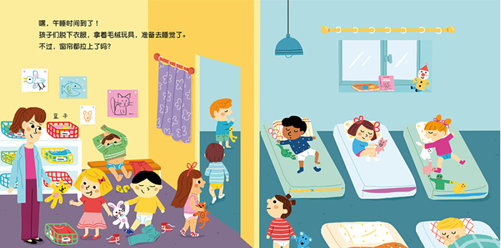 孩子走出家庭,踏入社会,首先接触就是幼儿园这一大集体。本书讲述了孩子们幼儿园的一天生活,记录了他们从踏入教室、上课、玩课间游戏、吃饭、睡午觉等一系列过程,这是法国Nathan出版社针对2-4岁孩子而设计的一套科普类玩具书,完美地将严肃枯燥的科普知识通过通俗易懂的语言、活泼俏皮的图画以及各种创新的设计(触摸、立体、翻翻、转转、推推等)来阐释,内容丰富,形式多样,能吸引低龄孩子的眼球,培养他们的阅读兴趣,在玩一玩中学到各种科学知识。